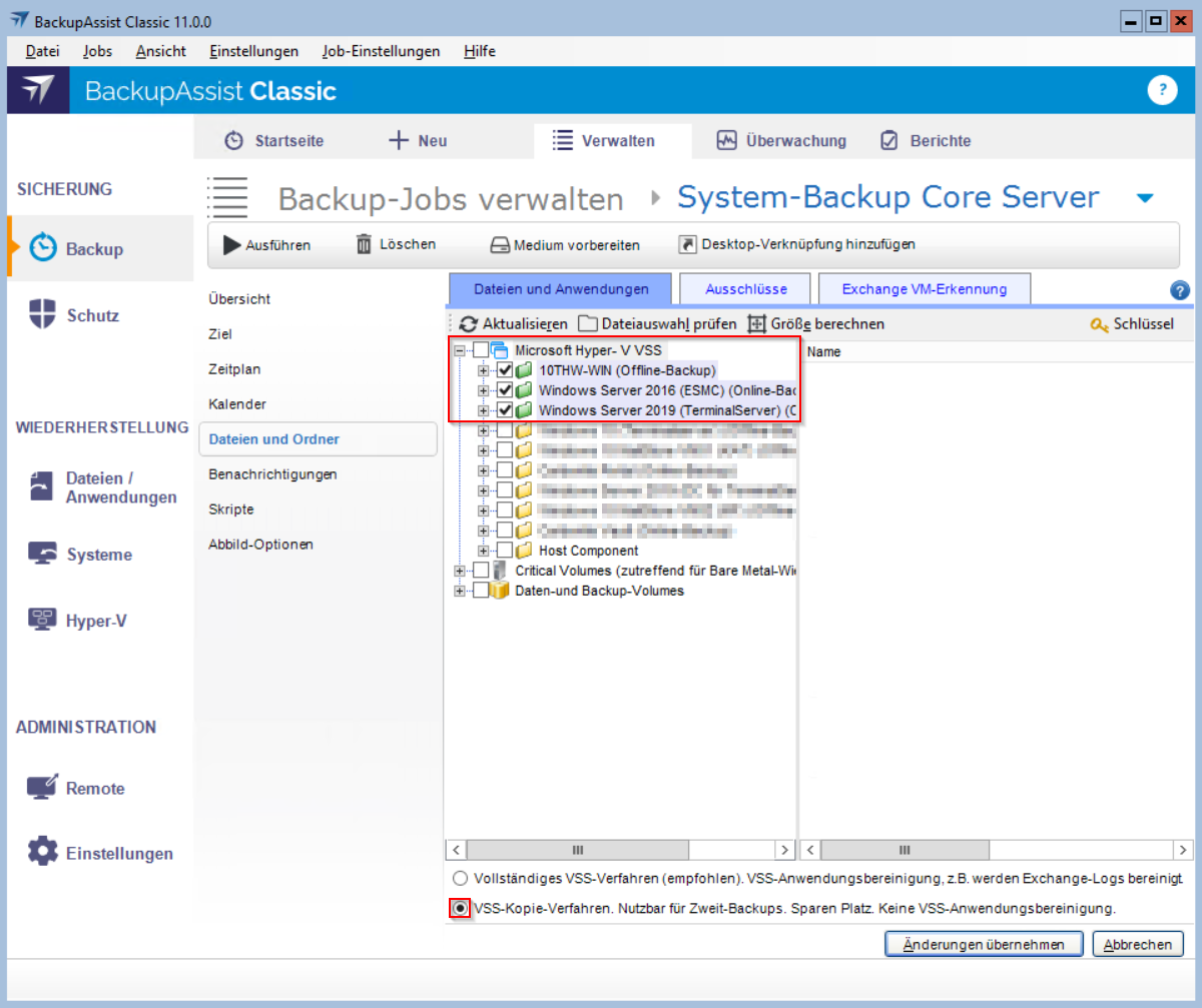 Hyper-V Systeme werden bei einer Systemsicherung, die auf der Windows Serversicherung aufbaut, im VSS-Vollverfahren immer mit eingeschlossen. Dies trifft auch zu, sobald Sie auch nur eine einzelne VM auf der gleichen Partition auswählen.