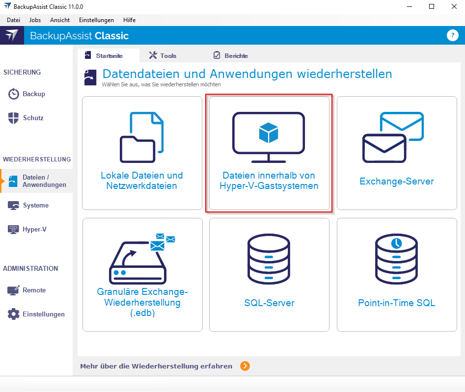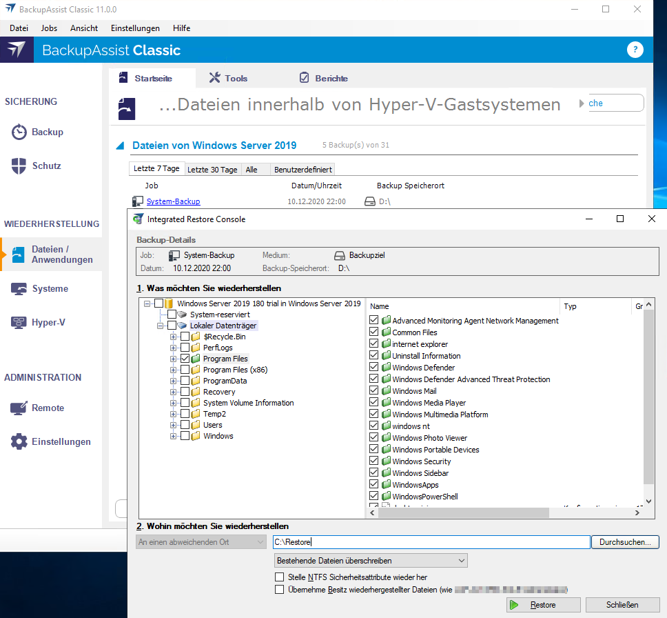 Hyper-V Restore mit BackupAssist Classic: Granuläre Dateien wiederherstellen