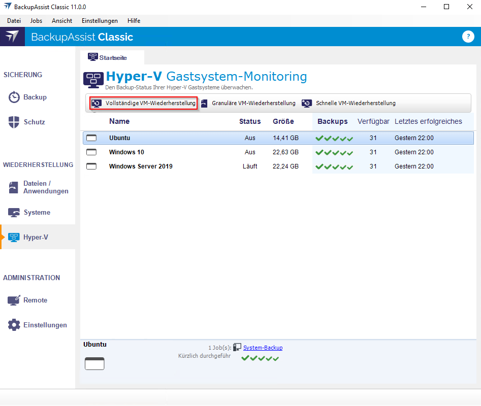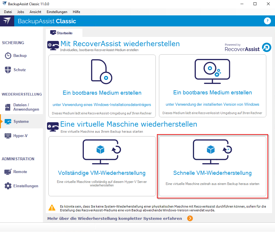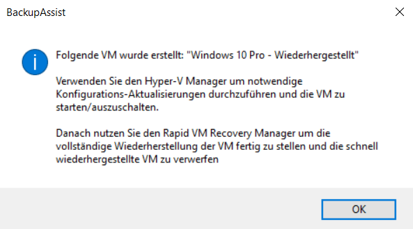 In diesen Schritten zeigen wir Ihnen, wie Sie eine zuvor schnell gesicherte VM mit BackupAssist Classic nun vollständig wiederherstellen können. In diesem Vorgang wird die .VHD-Datei der entsprechenden Maschine aus dem Backup auf den Hyper-V Host kopiert und die VM so konfiguriert, dass diese auf die .VHD-Datei zeigt. Alle Daten, die während des Betriebes der schnell wiederhergestellten VM verändert wurden, sind in der .VHD-Datei enthalten.