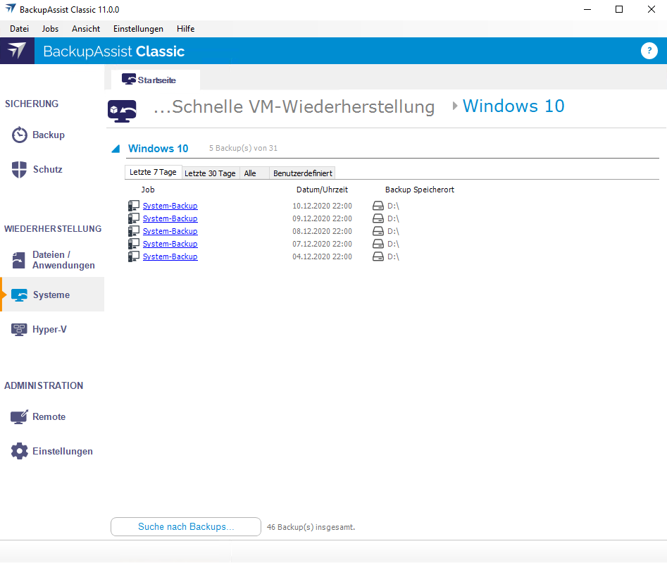 Die Tabs oberhalb der Auswahl werden Ihnen helfen das gewünschte Backup zu finden.