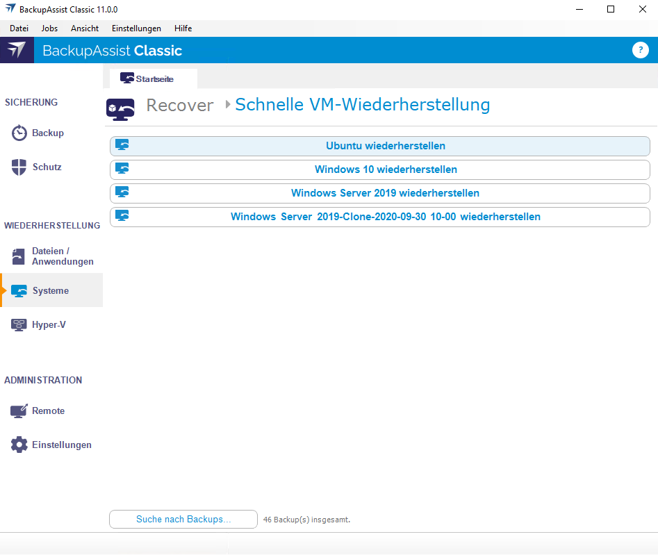Mit BackupAssist Classic lassen sich System-Backups des physischen Hyper-V-Hosts erstellen und als Grundlage für alle Arten von Backup- und Wiederherstellungsszenarien verwenden. Mithilfe dieses Images können Sie den kompletten Server, einzelne Gastmaschinen oder Dateien und Ordner der Gastmaschinen (erfordert das optionale Hyper-V Advanced Add-on) unkompliziert wiederherstellen.