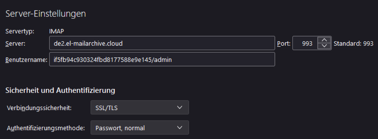 Bitte dann noch beim Posteingangsserver Port 993 nehmen und SSL/TLS auswählen. Die Server-Einstellungen sollten nun ungefähr so aussehen: