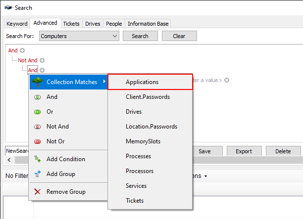 6. Klicken Sie auf das dritte And und wechseln die Einstellung auf Collection Matches > Applications.