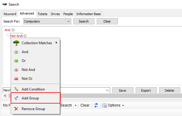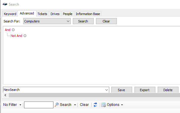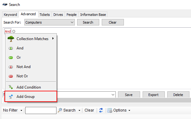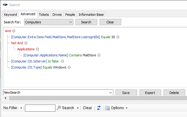 Sie haben auch die Möglichkeit, zusätzliche Bedingungen wie "Ist ein Server" oder ein Extra Data Field hinzuzufügen. In diesem Fall würde die Suche z.B. folgendermaßen aussehen: