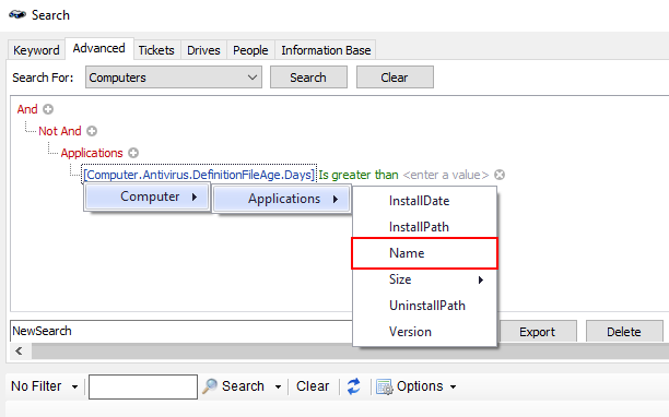 7. Nun klicken Sie auf den Parameter Computer.Antivirus.DefinitionFileAge.Days und ändern diesen in "Computer > Applications > Name".