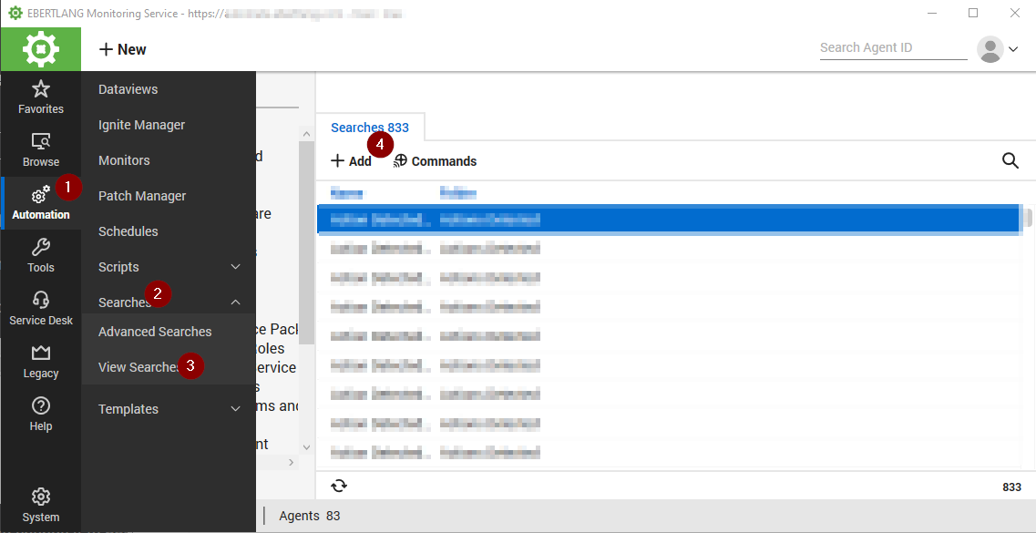 1. Beginnen Sie mit einer neuen Suche, indem Sie im Control Center zu "Automation > Searches > View Searches" navigieren und anschließend auf Add klicken.