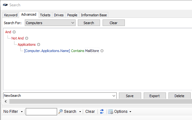8. Hier können Sie nun den Namen der Software auswählen, nach der gesucht werden soll und den Filter anpassen (Equals, Contains, Does not contain, ...). Im folgenden Beispiel wird nach allen Computern gesucht, die keine Software installiert haben, die das Wort MailStore enthält: