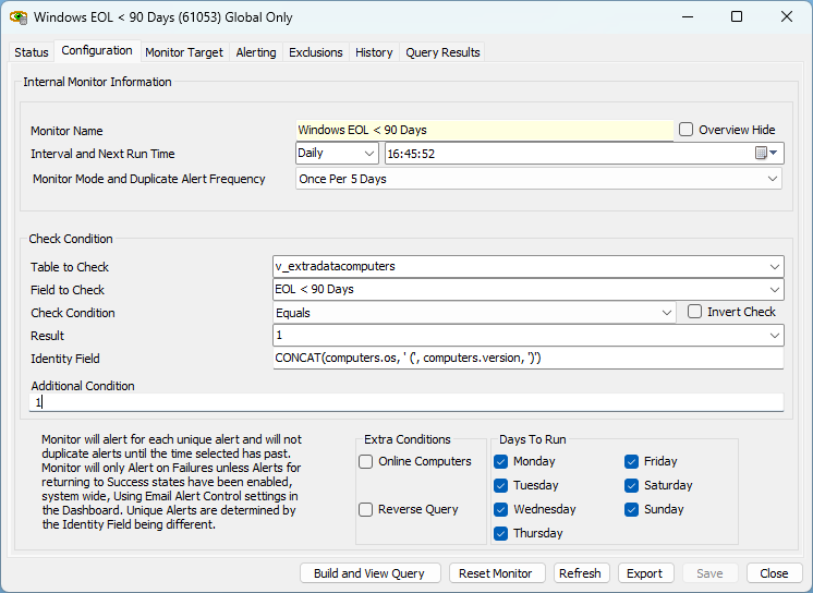 Die Anzahl Tage ist im Script „Set EOL Extradata Fields" anpassbar. Dieses Feld kann für die Erstellung von Searches und Gruppen sowie für Internal Monitors genutzt werden.