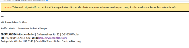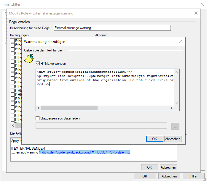 Die Regel "External message warning" im Inhaltsfilter: