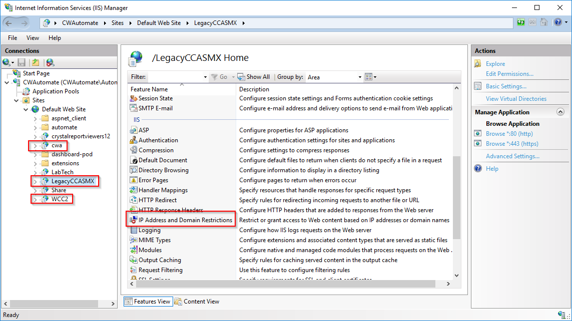 Die externe Kommunikation mit dem ConnectWise Automate-Server erfolgt über IIS-Sites. Dabei ist die Site "LabTech" für die Agent-Kommunikation zuständig. Hier dürfen keine Beschränkungen hinterlegt werden. Der Zugriff für Techniker erfolgt je nach Plattform über folgende Sites: