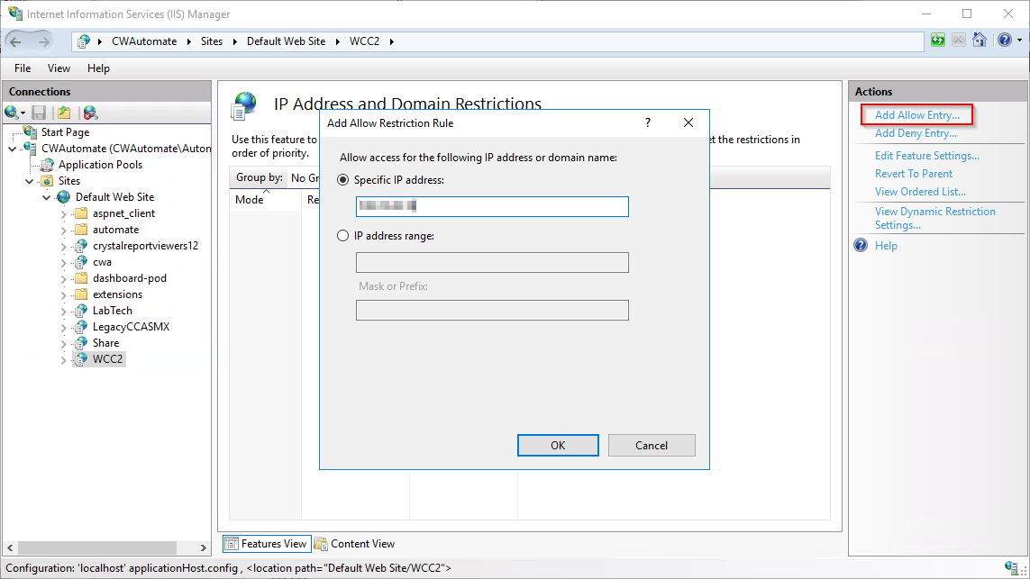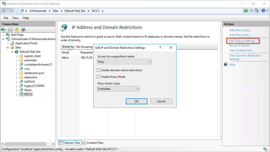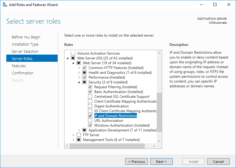 Unter Umständen müssen Sie die Rolle "IP Address and Domain Restrictions" (Einschränkungen für IP-Adressen und Domänen) zunächst installieren: