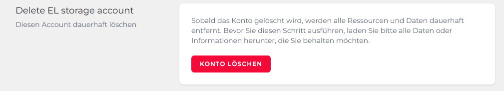 Das Löschen des gesamten EL storage Accounts löscht auch automatisch alle noch verbliebenen Daten. Dieser Schritt kann nicht rückgängig gemacht werden. Zur Durchführung ist eine erneute Passworteingabe erforderlich.