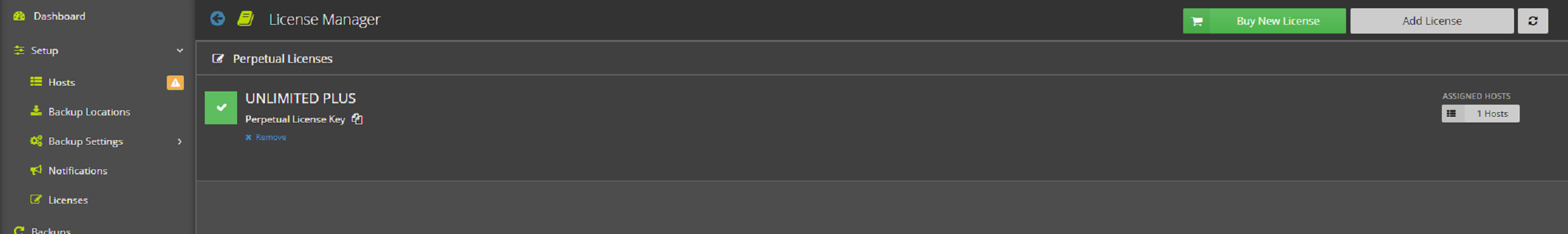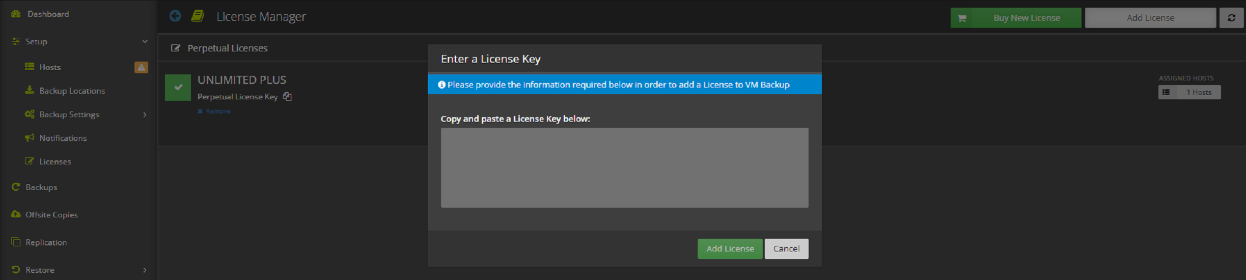 Hinweis: Seit der Version 8.16.7.0 gibt es für die Lizenzaktivierung einen Lizenz-Manager. In den vorherigen Versionen werden Lizenzen über den Punkt Setup → Hosts oder in der oberen rechten Ecke über den Button "SMA" (Software Maintenance Agreement) in Ihrer Altaro VM Backup-Installation eingespielt.