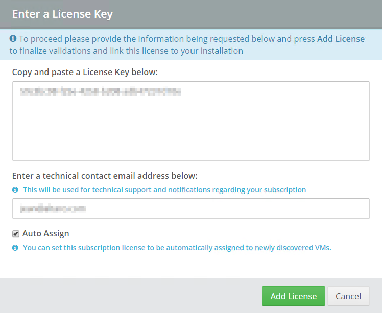 Sie haben außerdem die Möglichkeit, die Option "Auto Assign" zu verwenden. Nachdem diese Option aktiviert ist, werden neu erstellte virtuelle Maschinen direkt zu Ihrer Subscription hinzugefügt. Sobald Sie alles Ihren Wünschen entsprechend konfiguriert haben, klicken Sie auch hier auf "Add License".