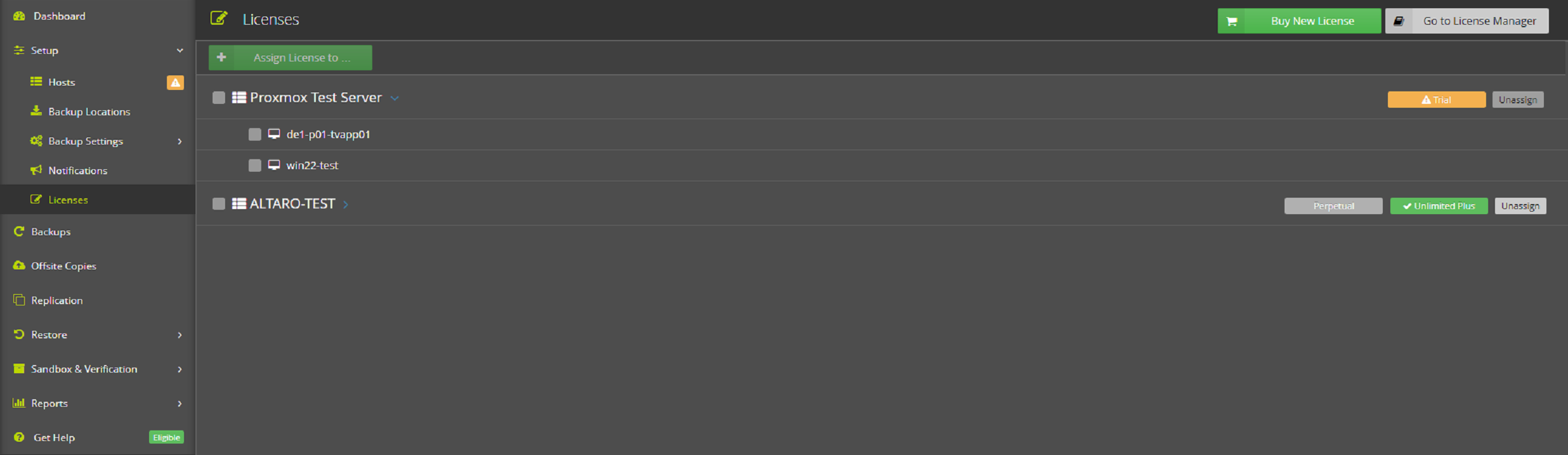 Hinweis: Falls Sie eine Lizenz, welche einem Host oder einer VM zugewiesen wurde, wieder entfernen möchten, navigieren Sie in der Altaro VM Backup-Konsole zu Setup → License und klicken dort auf den Button "Unassign" bei der gewünschten VM oder dem gewünschten Host.