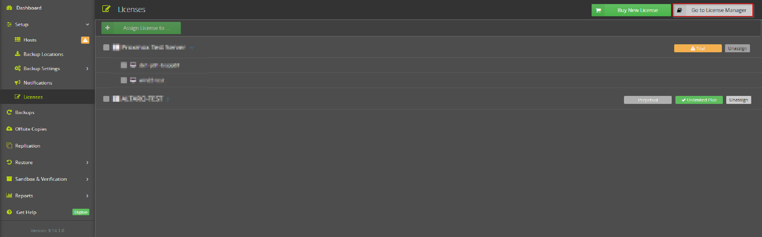 - Navigieren Sie in Ihrer Altaro VM Backup-Installation zu Setup → Licenses. Klicken Sie dort auf den Button "Go to License Manager".