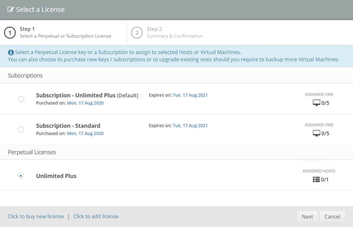 Wählen Sie dann die gewünschte Lizenz aus dem Menü aus. Klicken Sie nun auf den Button "Next" und zur Bestätigung auf "Assign License". Damit haben Sie nun Ihre Lizenz in Altaro VM Backup eingespielt.