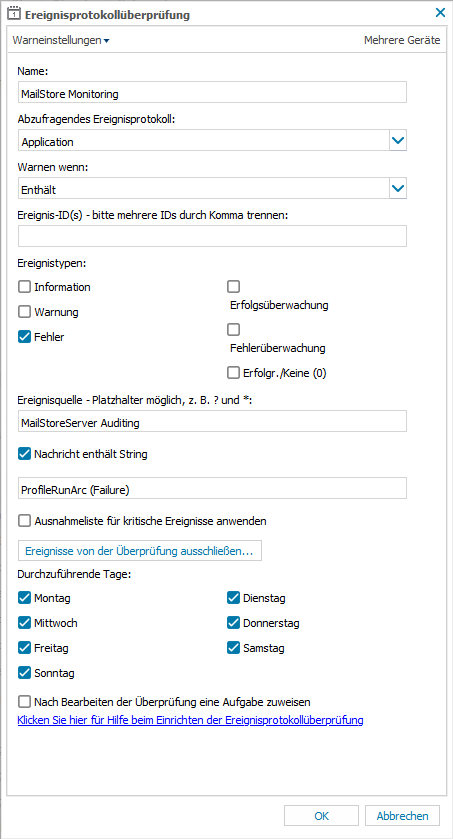 Bei der Konfiguration der Option "Durchzuführende Tage" stellen Sie bitte sicher, dass das überwachte Ereignis (also die Archivierung) in den 24 Stunden vor der täglichen Sicherheitsüberprüfung erzeugt wird. Sollte die Archivierung täglich laufen, gibt es nichts weiter zu beachten.