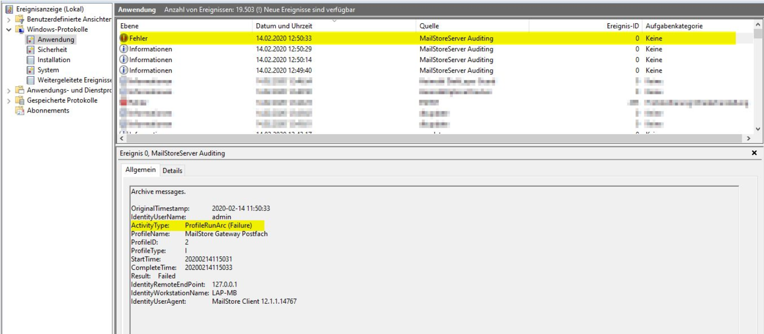 ● Suchen Sie dort nach Ereignissen der Quelle MailStoreServer Auditing.