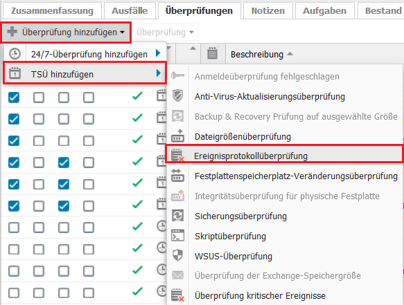 Bitte fügen Sie auf dem entsprechenden N-sight-Agent, auf dem MailStore Server läuft, eine neue TSÜ-Überprüfung für eine Ereignisprotokollüberprüfung hinzu (diese prüft die letzten 24h des Ereignislogs):