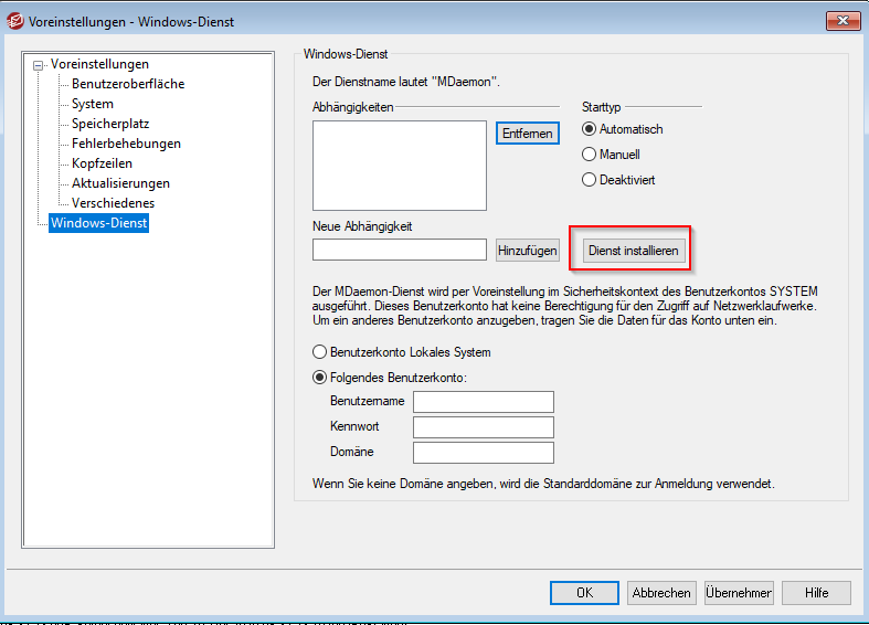 3. Beenden Sie MDaemon und starten Sie nun den Dienst.Ab sofort wird nach einem Neustart des Servers auch der Dienst von MDaemon automatisch gestartet.