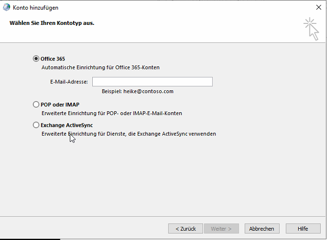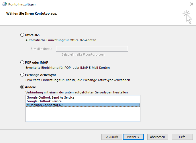 Bei der Einrichtung von Outlook via Assistent oder über die Systemsteuerung wird der MDaemon Connector for Outlook nicht mehr als Auswahlmöglichkeit für die Konfiguration eines E-Mail-Kontos angeboten.