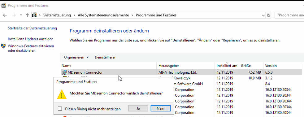 Indem Sie den MDaemon Connector for Outlook in der 32-Bit-Version über die Windows-Systemsteuerung deinstallieren, können Sie das Problem beheben.