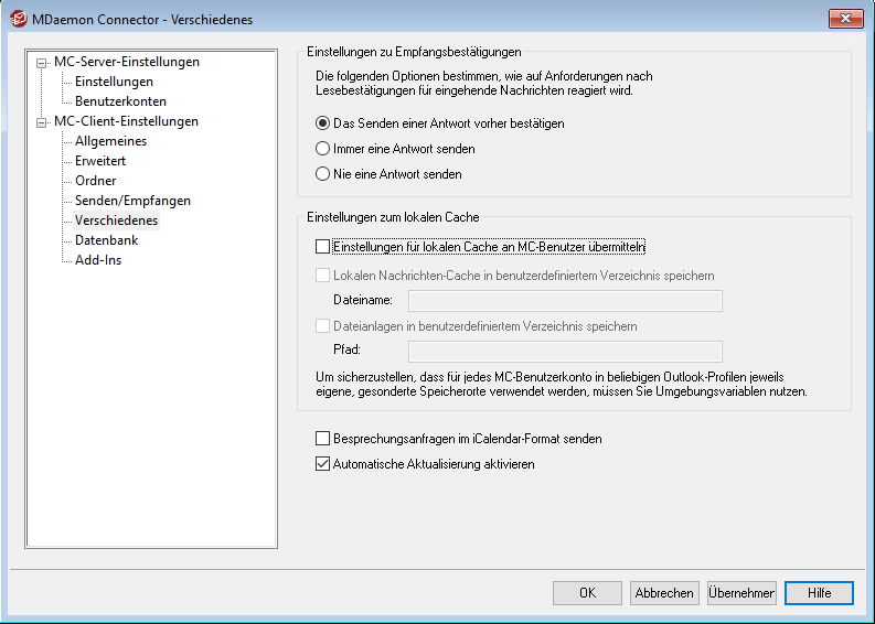Mit der Option Lokalen Nachrichten-Cache in benutzerdefiniertem Verzeichnis speichern (Dateiname) können Sie den lokalen Nachrichten Cache des MDaemon-Connector-Clients in einem bestimmten Verzeichnis abspeichern.