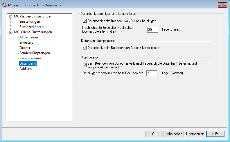 Mit dieser Option komprimiert und defragmentiert der MDaemon Connector seine Datenbankdatei, die die lokal zwischengespeicherten Kopien der Nachrichten enthält, beim Beenden von Microsoft Outlook. Auch hier ist der Sinn ein Ersparnis von Speicherplatz und die Erhöhung der Performance. Dies trifft nur auf die Fälle zu, in denen Outlook ordnungsgemäß beendet wurden. Bei einem Absturz, oder dem Beenden von Outlook über den Taskmanager wird dies nicht durchgeführt. Auch diese Option ist per Voreinstellung aktiv.