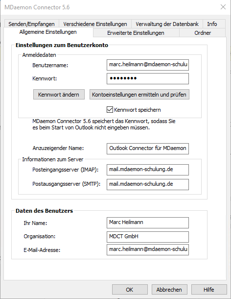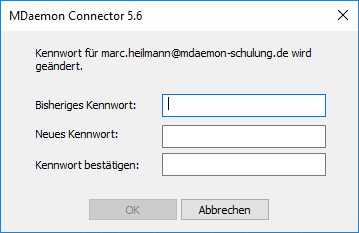 Dies wäre einmal das Kennwort des Benutzers, dies kann nun auch im MDaemon Connector geändert werden: