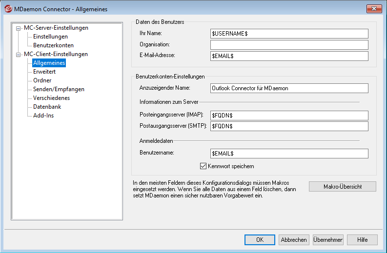 Im Feld Daten des Benutzers werden der Name, Organisation und E-Mail Adresse des entsprechenden Nutzers per Makros übergeben.