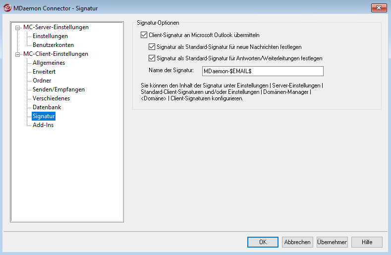 Jetzt erfolgt die Konfigurationseinstellungen der Signaturen für die MDaemon Connector-Clients: