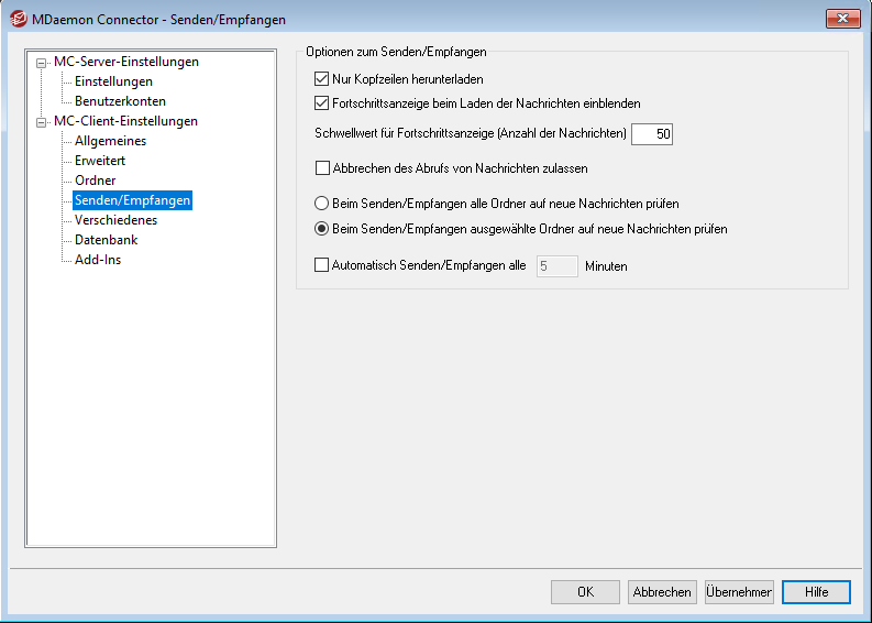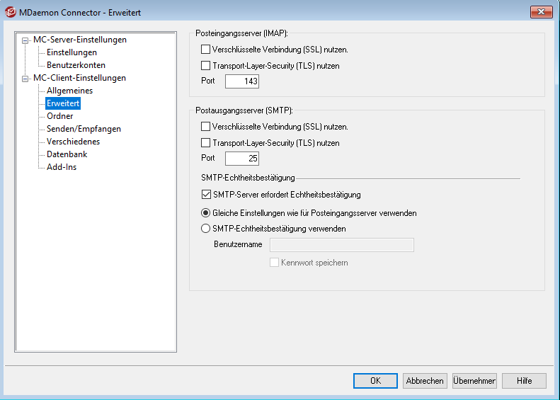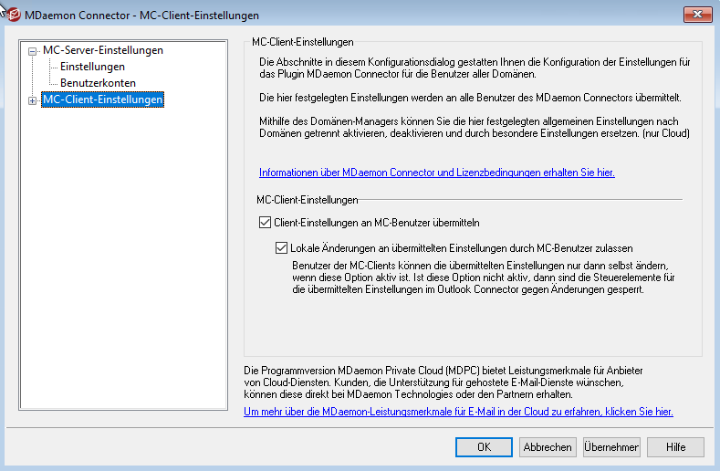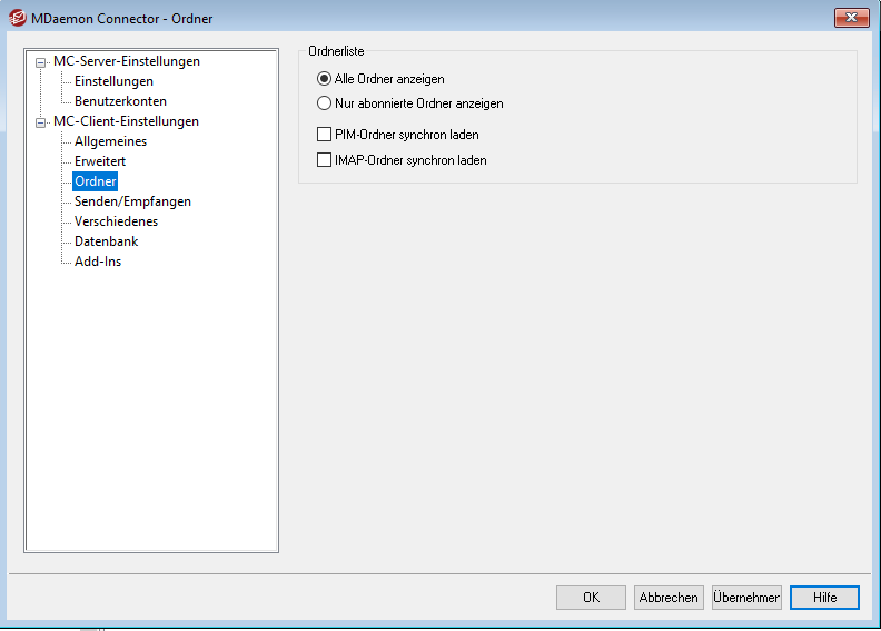 Sie finden diese Einstellungen im MDaemon unter Einstellungen → MDaemon Connector → MC-Client-Einstellungen.