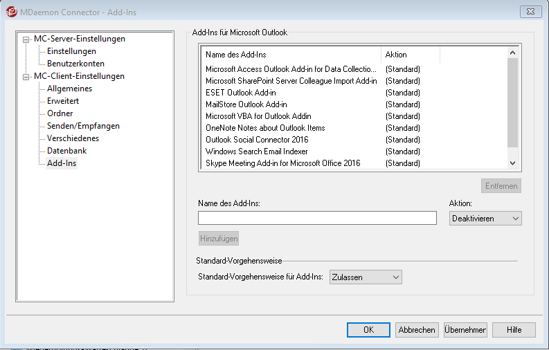 Bei der Standard-Vorgehensweise gibt es die einmal die Möglichkeit die Add-Ins zuzulassen, oder zu deaktivieren. Ist die Standard-Vorgehensweise Zulassen, so deaktiviert der MDaemon Connector per Voreinstellung nur solche Add-Ins, die in der Liste auf Deaktivieren gesetzt sind.