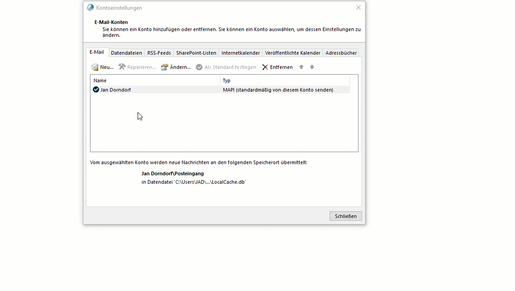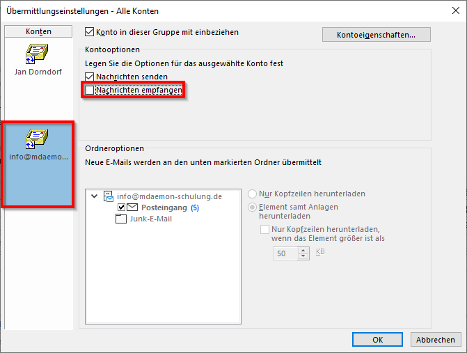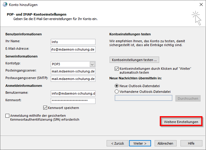 Dafür muss in dem bestehenden Outlookprofil auf der gewünschten Arbeitsstation mit dem MDaemon Connector-Konto ein weiteres POP-Konto (mit der „info@“- oder „sales@“- Adresse) hinzugefügt werden. Dieses neue Konto wird nur die Berechtigung zum Senden haben.