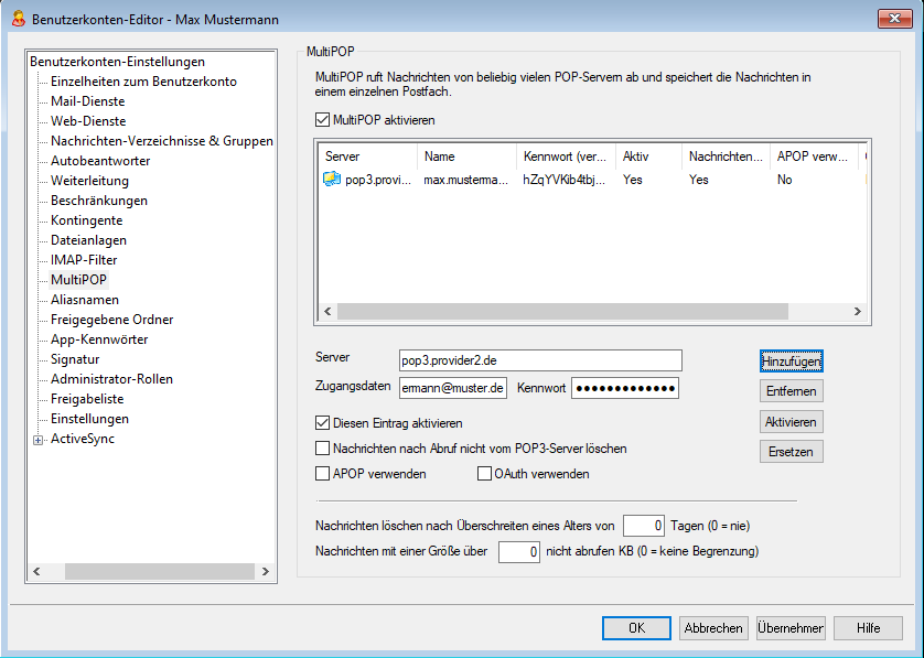 Sie können für jeden Benutzer beliebig viele Postfächer, bei beliebigen Providern per MultiPOP abrufen. Die Konfiguration dafür erfolgt für jeden einzelnen Benutzer über den Menüpunkt "Benutzerkonten → Benutzerkonten-Manager" und im Benutzerkonto unter dem Reiter "MultiPOP". Bitte tragen Sie hier den POP-Server des Providers sowie die entsprechenden Zugangsdaten ein.