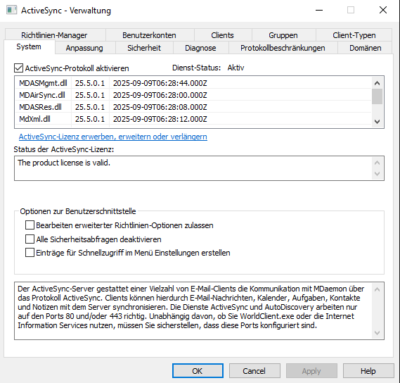 Um ActiveSync nutzen zu können, müssen Sie erst den ActiveSync-Server aktivieren bzw. den Test-Lizenzschlüssel anfordern.
