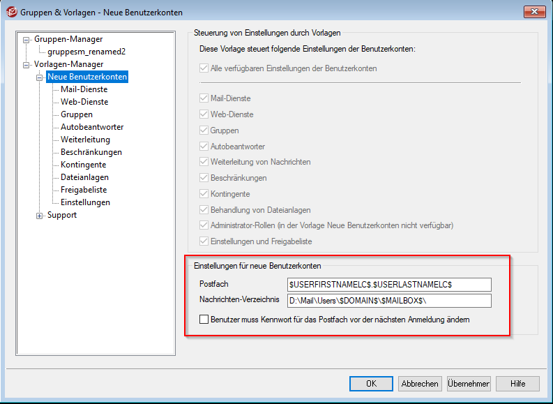 - Postfächer der Benutzer auslagern: Bevor die ersten Benutzer im MDaemon Email Server angelegt werden, empfiehlt es sich, darüber nachzudenken, die Postfächer der Benutzer (\MDaemon\Users\) auf einen anderen Datenträger auszulagern. Gerade in virtuellen Umgebungen können zukünftige Migrationen durch das "Aushängen" und "Einhängen" dieser virtuellen Festplatte, auf der sich dann lediglich die Postfächer befinden, wesentlich vereinfacht werden. Änderungen dazu nehmen Sie bitte in der Vorlage im MDaemon Email Server unter dem Menüpunkt "Benutzerkonten → Gruppen & Vorlagen → Vorlagen-Manager → Neue Benutzerkonten…" im Abschnitt "Einstellungen für neue Benutzerkonten" vor. Bitte verwenden Sie auch in dem neuen Pfad die Variablen $DOMAIN$ und $MAILBOX$.