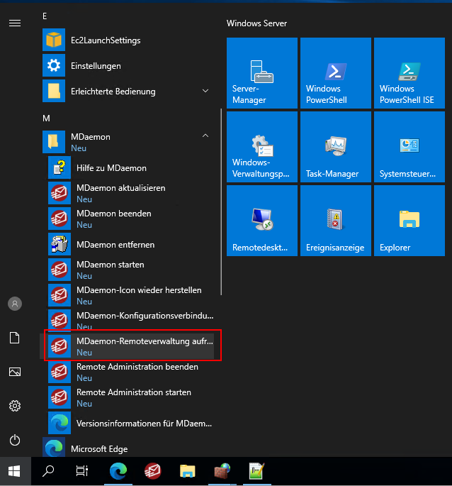 Mit Version 19 des MDaemon Email Server verweisen der Desktop-Shortcut sowie die Verknüpfung "MDaemon öffnen" im Windows-Startmenü nicht mehr auf die traditionelle MDaemon-Benutzeroberfläche, sondern rufen die MDaemon-Remoteverwaltung in einem Browser auf.