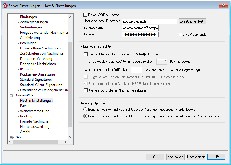 Mit dieser Option rufen Sie ein Sammelpostfach (sog. "Catch-All-Postfach") bei Ihrem Provider ab. Die Konfiguration dazu erfolgt im MDaemon Email Server unter "Einstellungen → Server-Einstellungen → DomainPOP → Host & Einstellungen".