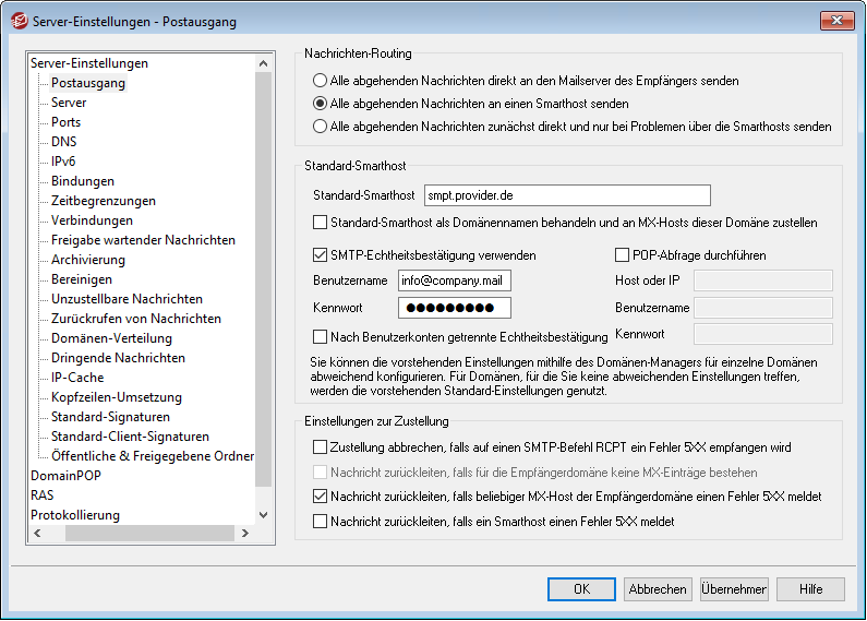 Geben Sie nun im Feld "Standard-Smarthost" den SMTP-Server Ihres Providers ein.