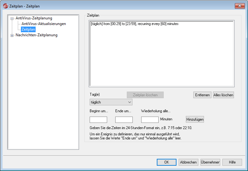 Öffnen Sie den MDaemon Email Server und gehen Sie im Menü "Einstellungen → Zeitplan → AntiVirus-Zeitplanung" zum Reiter "Zeitplan". Richten Sie hier einen Zeitplan zum Aktualisieren der Virendefinitionen ein. Wir empfehlen, die Signaturen jede Stunde aktualisieren zu lassen.