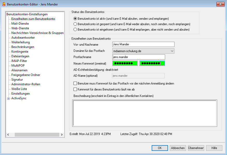 In der ersten Schaltfläche "Benutzerkonto" geben Sie bitte bei "Vor- und Nachname" den Namen des Benutzers ein. Wählen Sie die gewünschte Domäne für das Postfach aus. Die vollständige E-Mail-Adresse besteht dann aus dem Feld "Postfachname" und der Domäne. Diese Adresse ist zugleich der Benutzername zum Abholen der E-Mails von dem Client aus. Bei "Kennwort" geben Sie bitte ein sicheres Kennwort ein und wiederholen die Eingabe. Klicken Sie auf "Übernehmen".