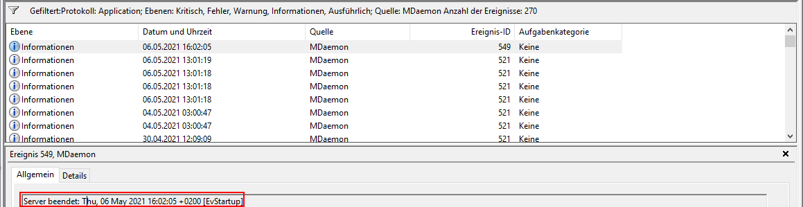 Hier wurde der Server-Dienst beendet. Dieser Eintrag kann überwacht werden, um festzustellen, ob der MDaemon-Dienst beendet wurde oder beispielsweise abgestürzt ist.