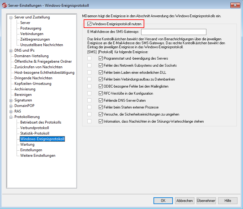 Im ersten Schritt aktivieren Sie im MDaemon Email Server die Nutzung der Ereignisanzeige. Hierfür navigieren Sie zu Einstellungen → Server-Einstellungen → Protokollierungen → Windows-Ereignisprotokoll. Dort aktivieren Sie die Option "Windows-Ereignisprotokoll nutzen".