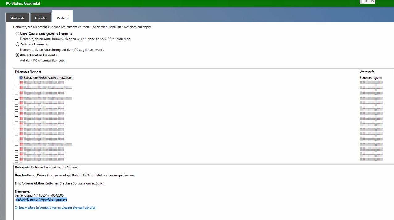 Ursache hierfür ist ein AV-Programm, dass die CFengine.exe aus dem \MDaemon\App-Pfad löscht/in Quarantäne verschiebt. Dadurch können die E-Mails nicht mehr auf SPAM oder Inhalte geprüft werden, und deren Verarbeitung wird eingestellt. Besonders anfällig hierfür ist der Windows Defender, da dieser erst seit Kurzem die SPAM- und Inhaltsfilter von MDaemon als Schadsoftware erkennt, sobald diese SPAM-Mails bzw. Anhänge mit Schadsoftware verarbeiten.