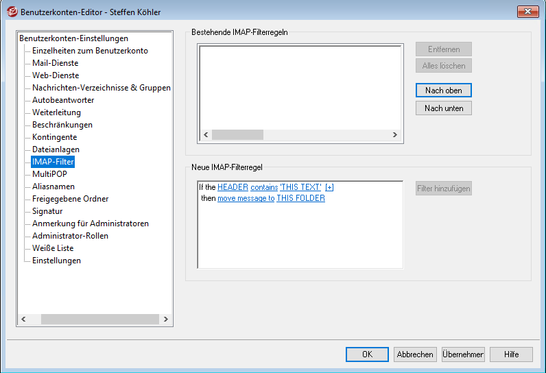 Alternativ kann auch der Administrator direkt in der Oberfläche des MDaemon Email Server oder via Remote-Administration in den Eigenschaften des Benutzerkontos die Regel erstellen. Hierzu bitte das Postfach im Benutzerkonten-Editor öffnen und in den Reiter "IMAP-Filter" wechseln.