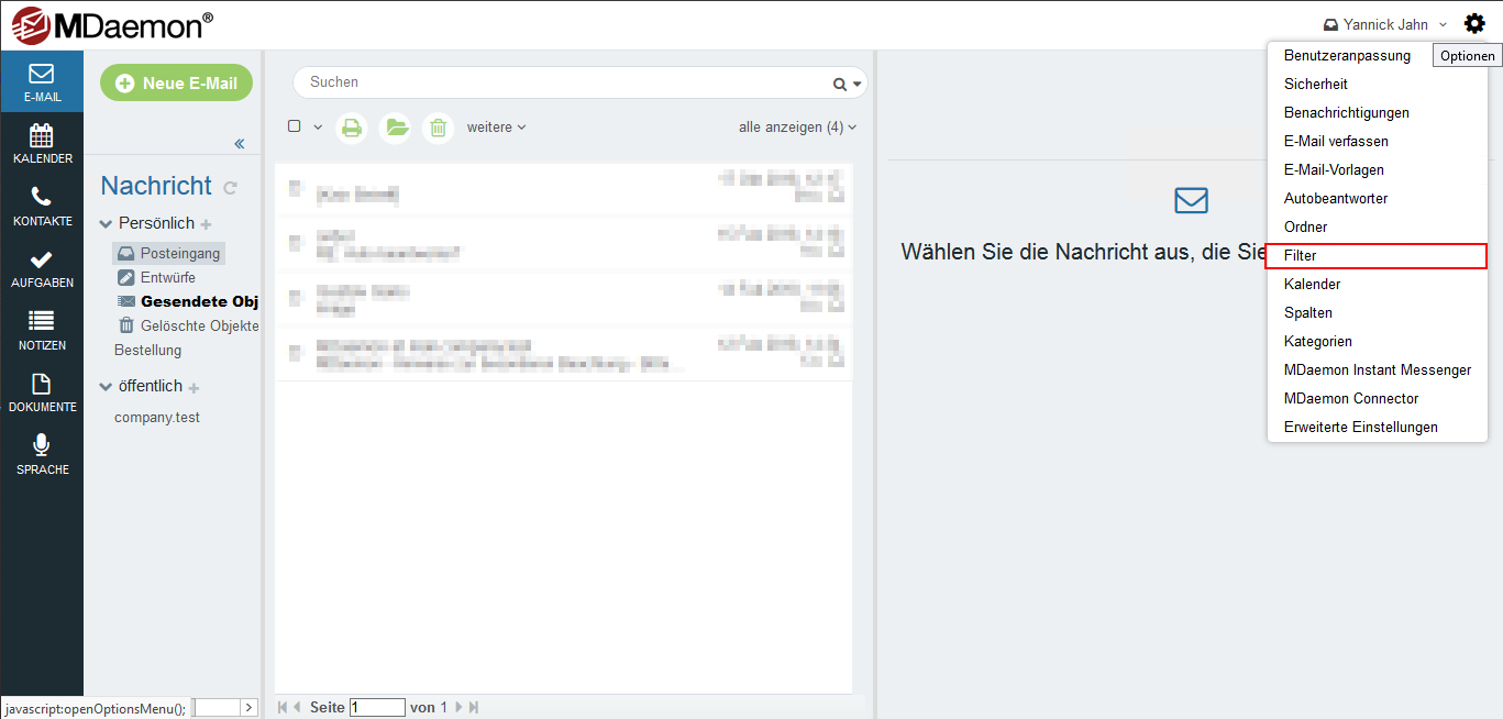 Sie sollten daher serverseitige IMAP-Filter nutzen, um Nachrichten automatisch in bestimmte Ordner zu verschieben, die Nachrichten an andere Adressen um- oder weiterzuleiten und um diese zu löschen. Jede eingehende Nachricht wird mit den Filtern verglichen, die Sie erstellt haben. Dabei werden diese Filter von oben nach unten durchlaufen. Erfüllt eine Nachricht die Kriterien eines Filters, so wird die Aktion ausgeführt, die in dem entsprechenden Filter festgelegt wurde. Nachdem Durchführung einer solchen durchläuft die Nachricht die weiteren Filter nicht mehr.