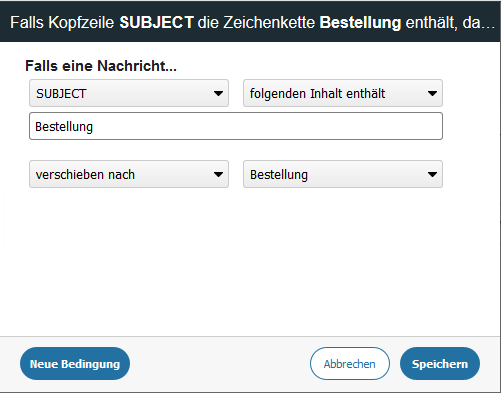 3. Nun müssen verschiedene Bedingungen und Optionen definiert werden. Im folgenden Beispiel wird dazu nach dem Bereich "SUBJECT" und dem Inhalt "Bestellung" gesucht.