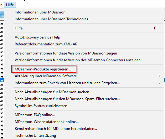 1. Klicken Sie im Menü bitte auf Hilfe → MDaemon-Produkte registrieren....